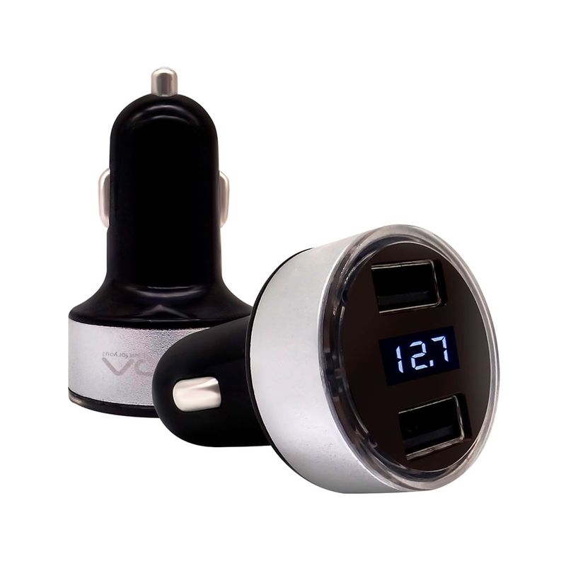 Funciona en auto y camión; Puerto USB y Tipo C; Entrada: 12V - 24V / Salida: 5V 2.4A; Material: ABS y aluminio