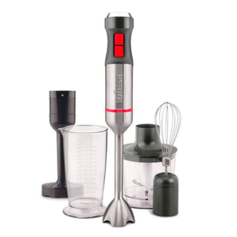 El Mixer UFESA BP4654 es un potente y versátil batidora de mano de 1200W. Incluye accesorios como un picador, varilla emulsionadora y vaso medidor. Su diseño ergonómico facilita su uso. Ofrece alta eficiencia con su cuchilla de acero inoxidable y velocidades ajustables.